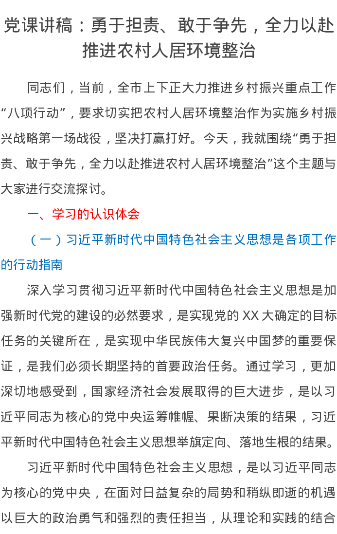 党课讲稿:勇于担责、敢于争先,全力以赴推进农村人居环境整治