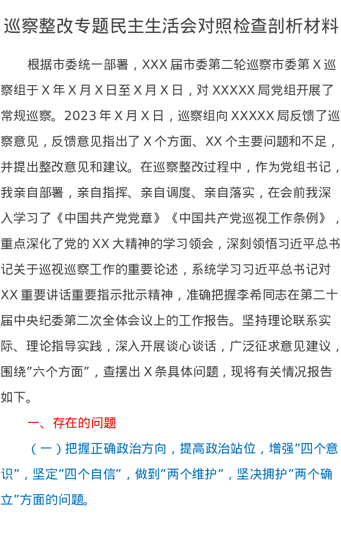 巡察整改专题民主生活会党组书记对照检查剖析材料