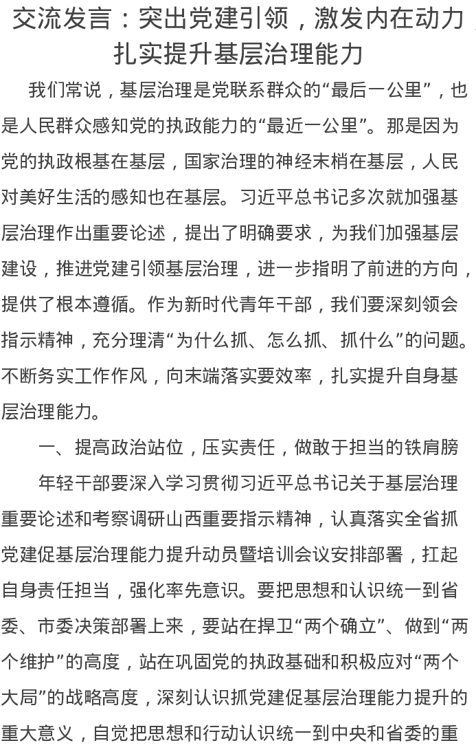 交流发言:突出党建引领,激发内在动力,扎实提升基层治理能力