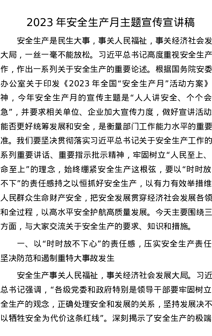 2023年安全生产月主题宣传宣讲稿