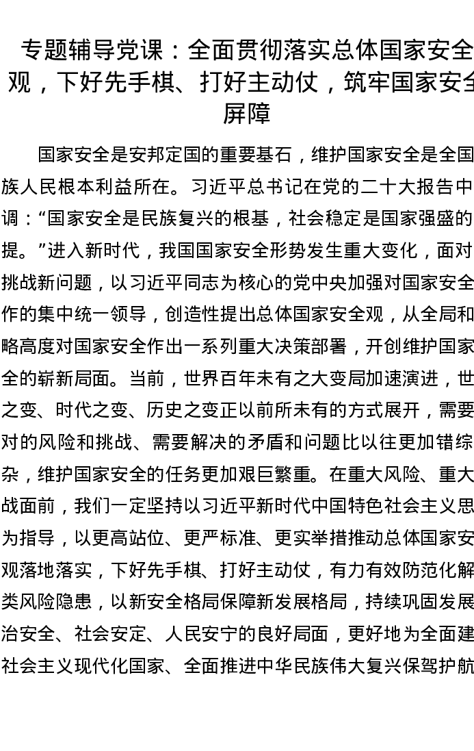 专题辅导党课:全面贯彻落实总体国家安全观,下好先手棋、打好主动仗,筑牢国家安全屏障