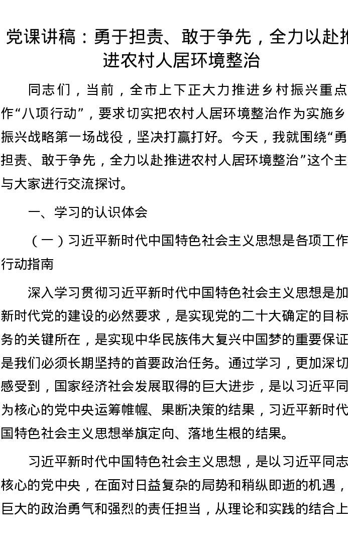 党课讲稿:勇于担责、敢于争先,全力以赴推进农村人居环境整治