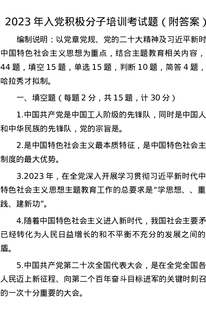 2023年入党积极分子培训考试题(附答案)