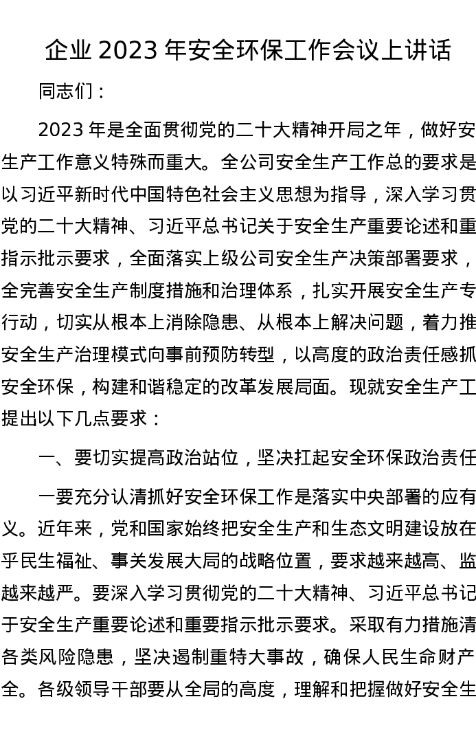 企业2023年安全环保工作会议上讲话