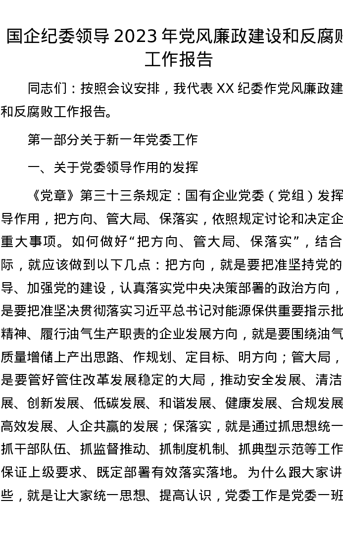 国企纪委领导2023年党风廉政建设和反腐败工作报告