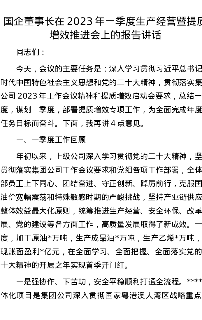 国企董事长在2023年一季度生产经营暨提质增效推进会上的报告讲话