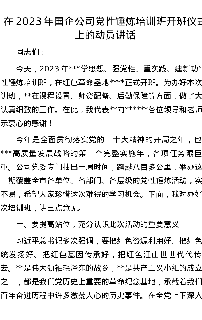 在2023年国企公司党性锤炼培训班开班仪式上的动员讲话