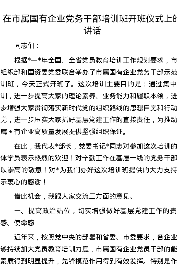 在市属国有企业党务干部培训班开班仪式上的讲话