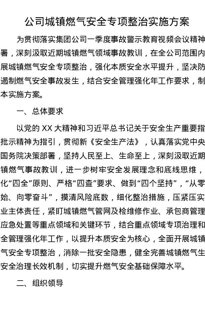 公司城镇燃气安全专项整治实施方案