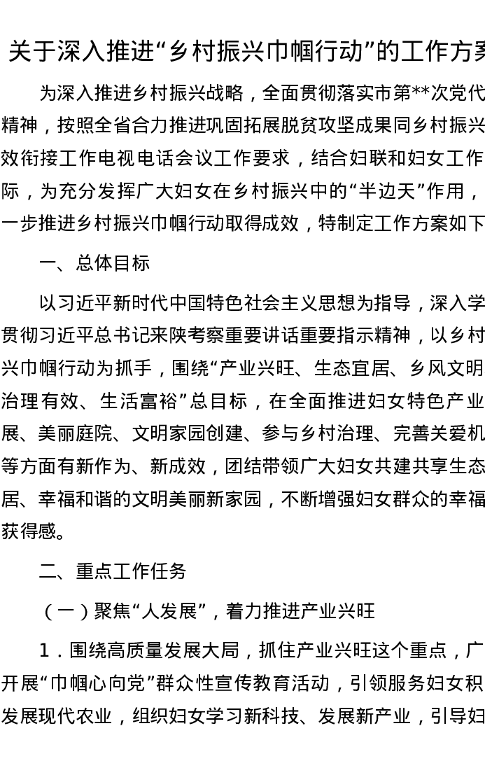 关于深入推进“乡村振兴巾帼行动”的工作方案