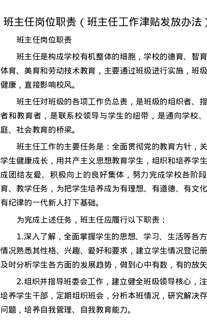 班主任岗位职责(班主任工作津贴发放办法)