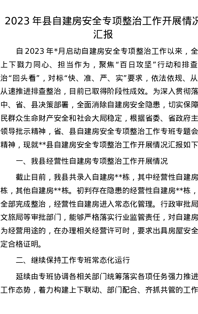 2023年县自建房安全专项整治工作开展情况汇报