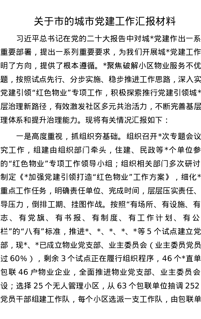 关于市的城市党建工作汇报材料
