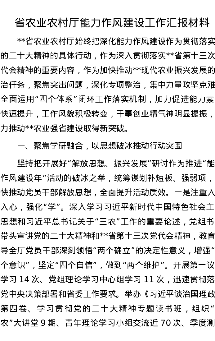 省农业农村厅能力作风建设工作汇报材料