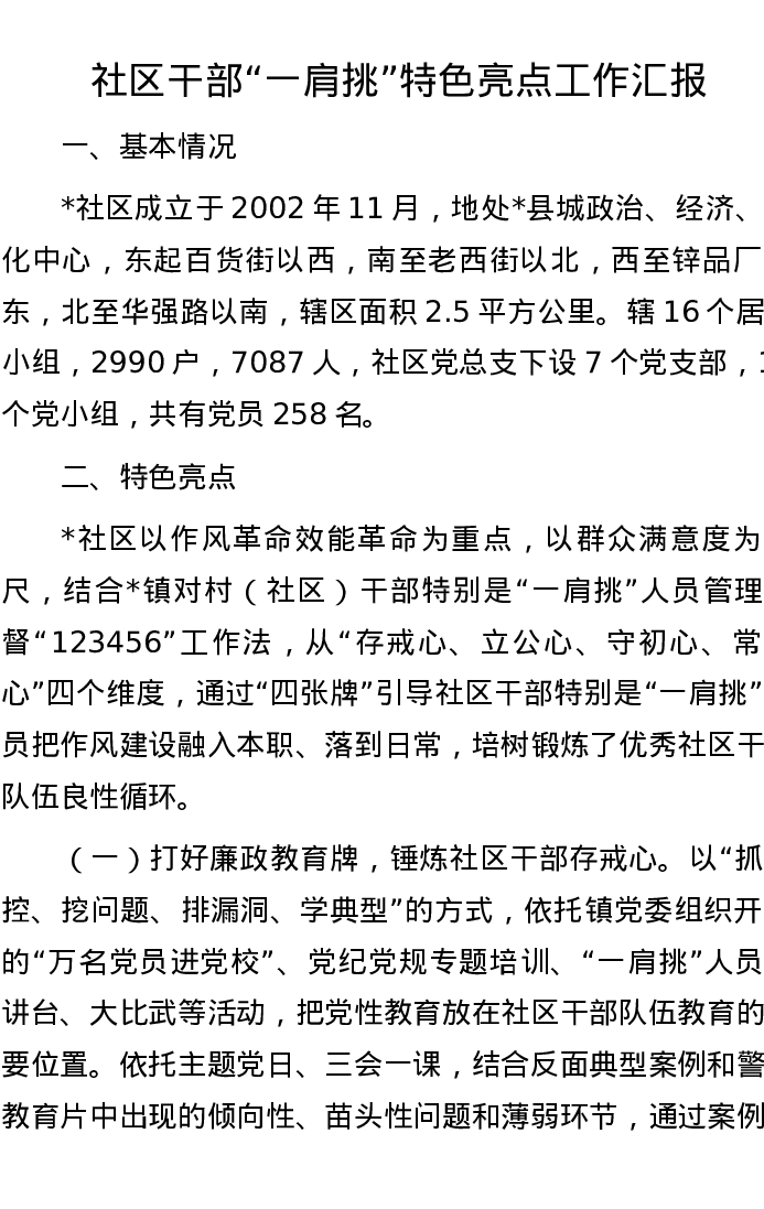 社区干部“一肩挑”特色亮点工作汇报