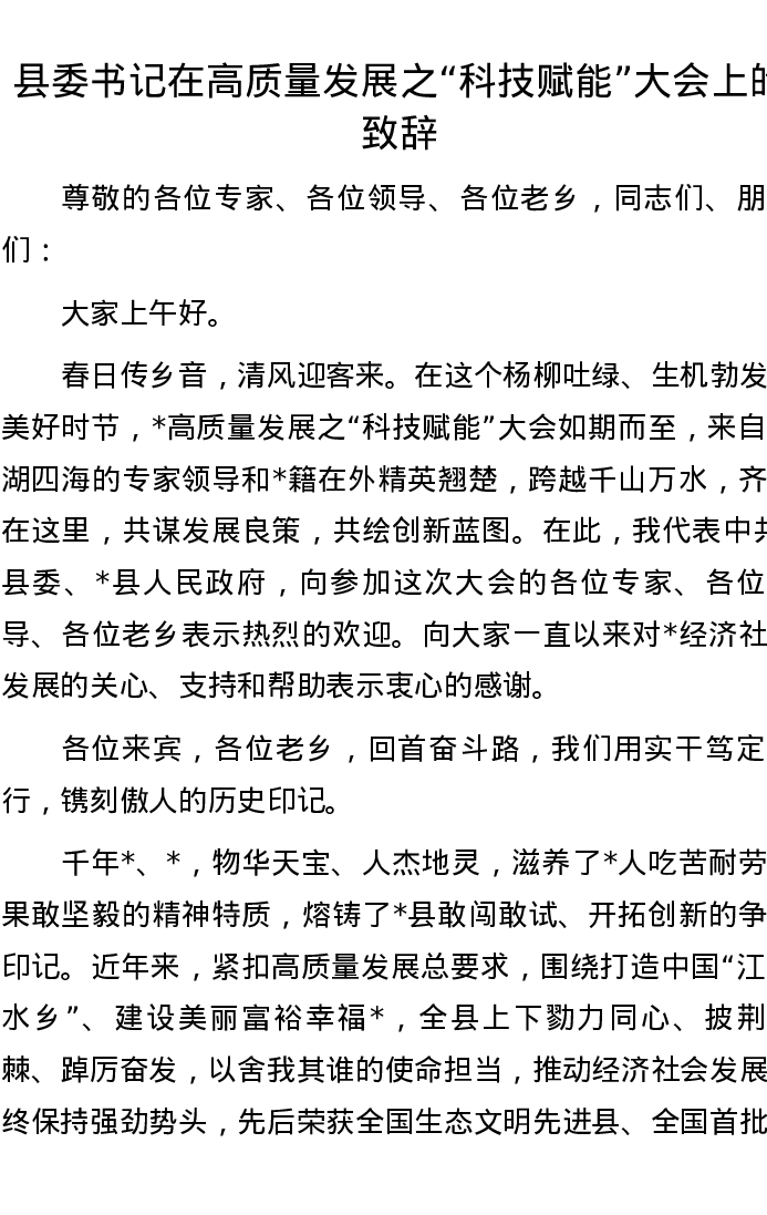 县委书记在高质量发展之“科技赋能”大会上的致辞