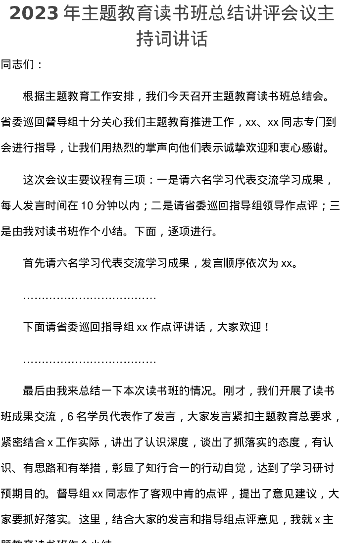 2023年主题教育读书班总结讲评会议主持词讲话(特色社会主义思想)