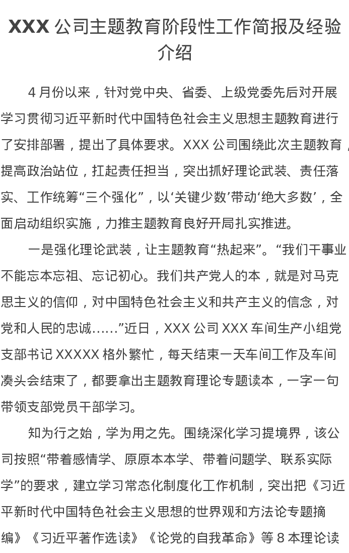 XXX公司主题教育阶段性工作简报及经验介绍(特色社会主义思想)