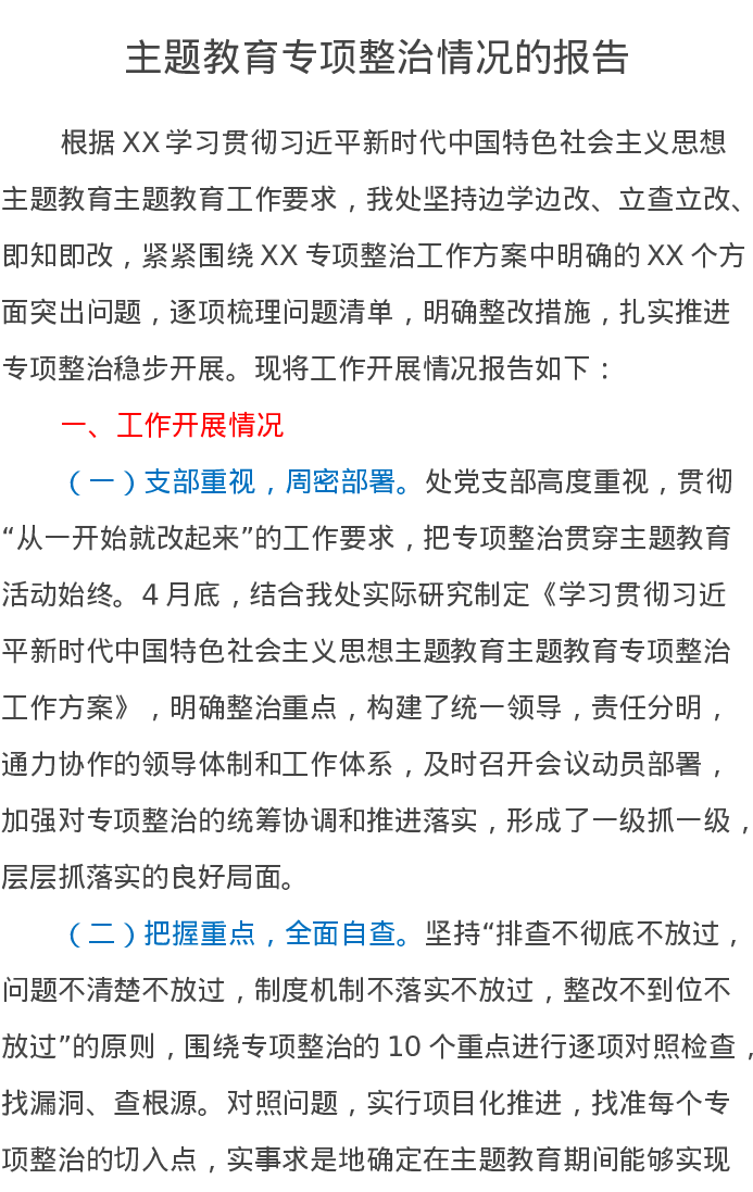 主题教育专项整治情况的报告(特色社会主义思想)