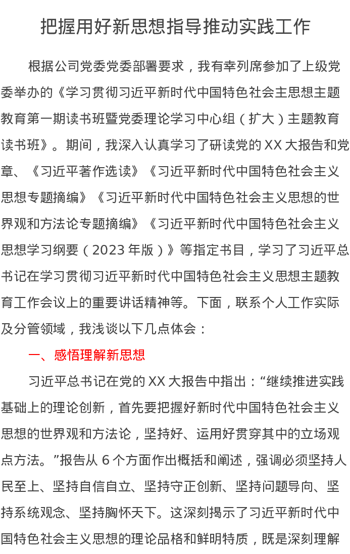 主题教育发言:把握用好新思想指导推动实践工作(特色社会主义思想)