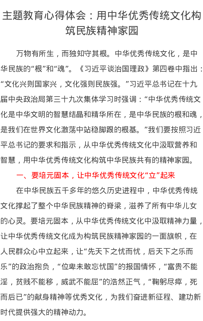 主题教育心得体会:用中华优秀传统文化构筑民族精神家园(特色社会主义思想)
