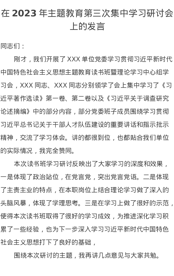 在2023年主题教育第三次集中学习研讨会上的发言(特色社会主义思想)