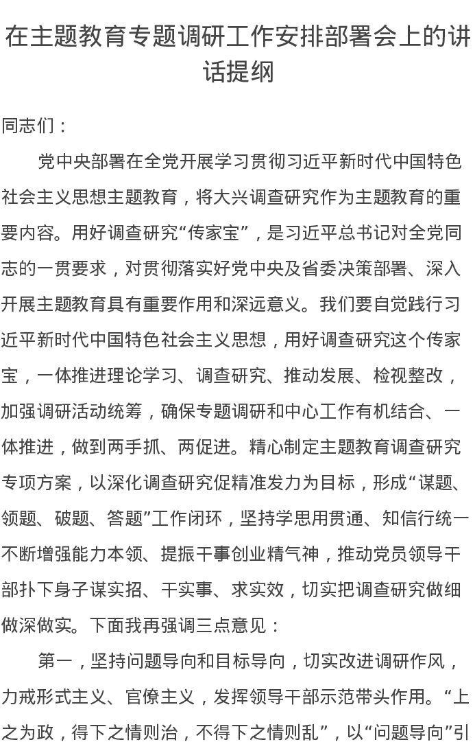 在主题教育专题调研工作安排部署会上的讲话提纲(特色社会主义思想)
