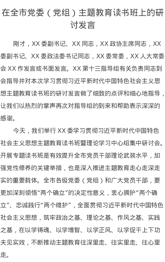 在全市党委(党组)主题教育读书班上的研讨发言(特色社会主义思想)