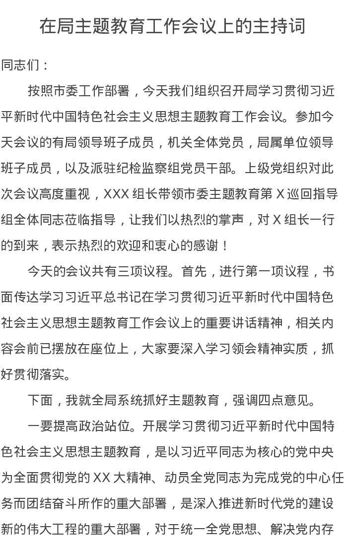 在局主题教育工作会议上的主持词(特色社会主义思想)