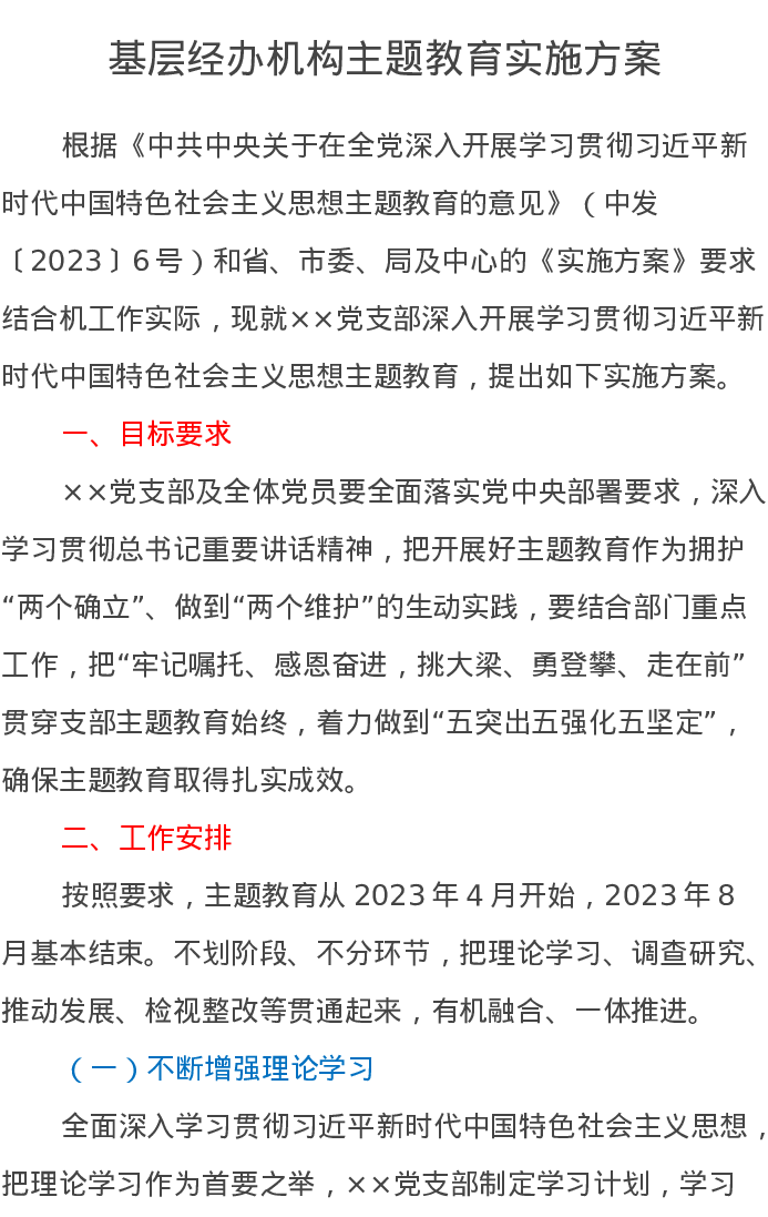 基层经办机构主题教育实施方案(特色社会主义思想)