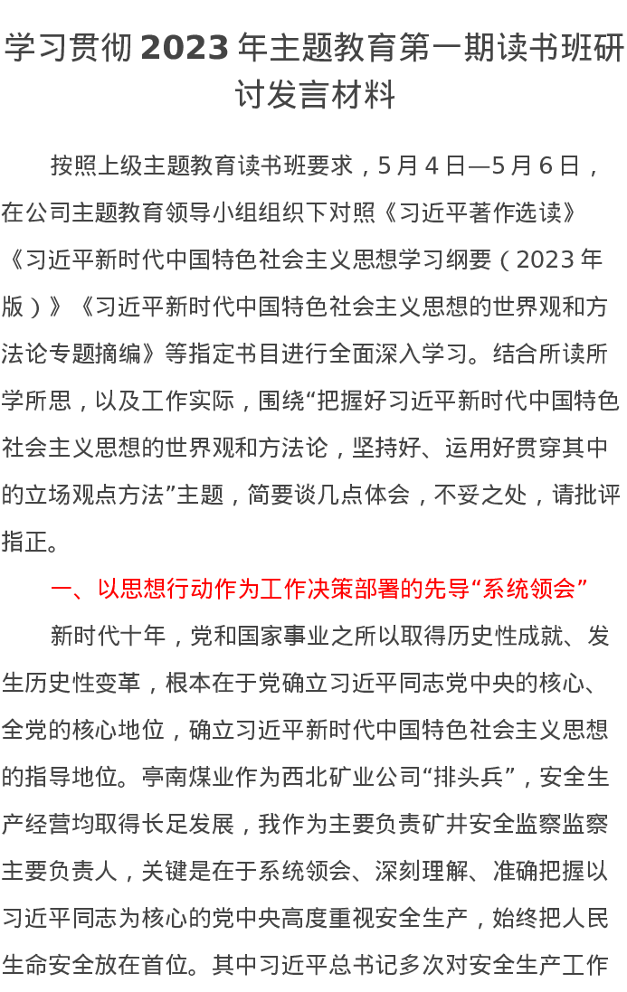 学习贯彻2023年主题教育第一期读书班研讨发言材料(特色社会主义思想)