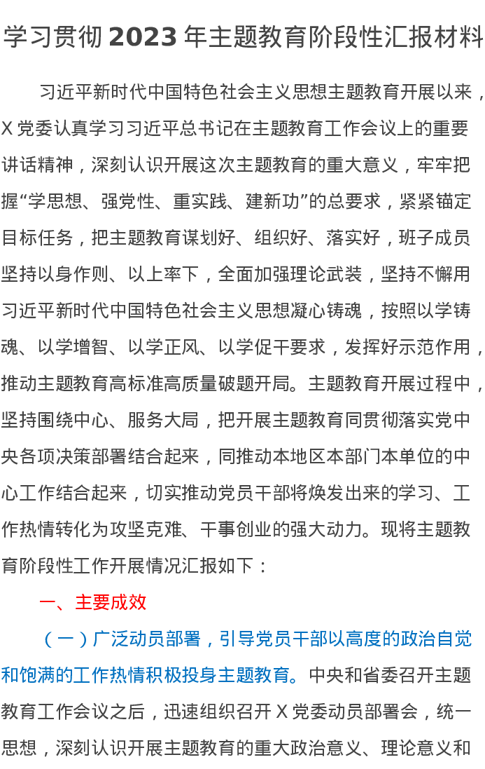 学习贯彻2023年主题教育阶段性汇报材料(特色社会主义思想)