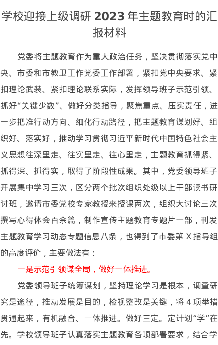 学校迎接上级调研2023年主题教育时的汇报材料(特色社会主义思想)