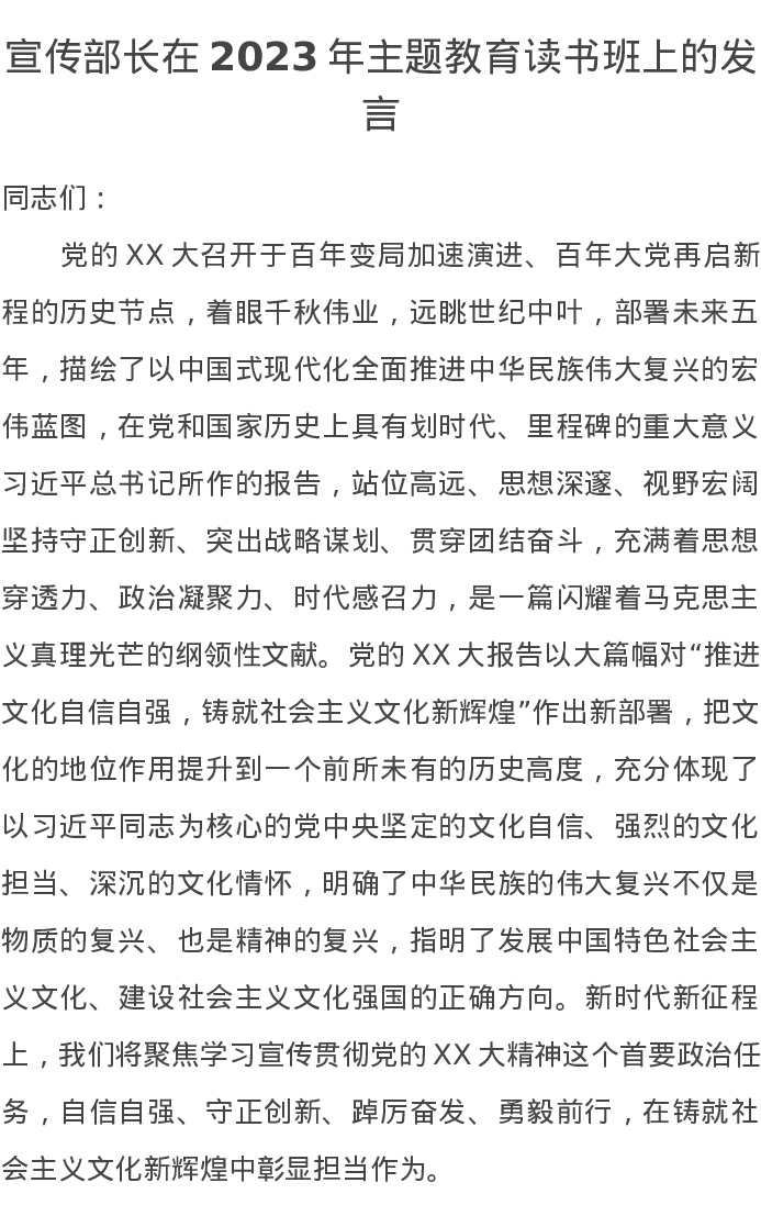 宣传部长在2023年主题教育读书班上的发言(特色社会主义思想)