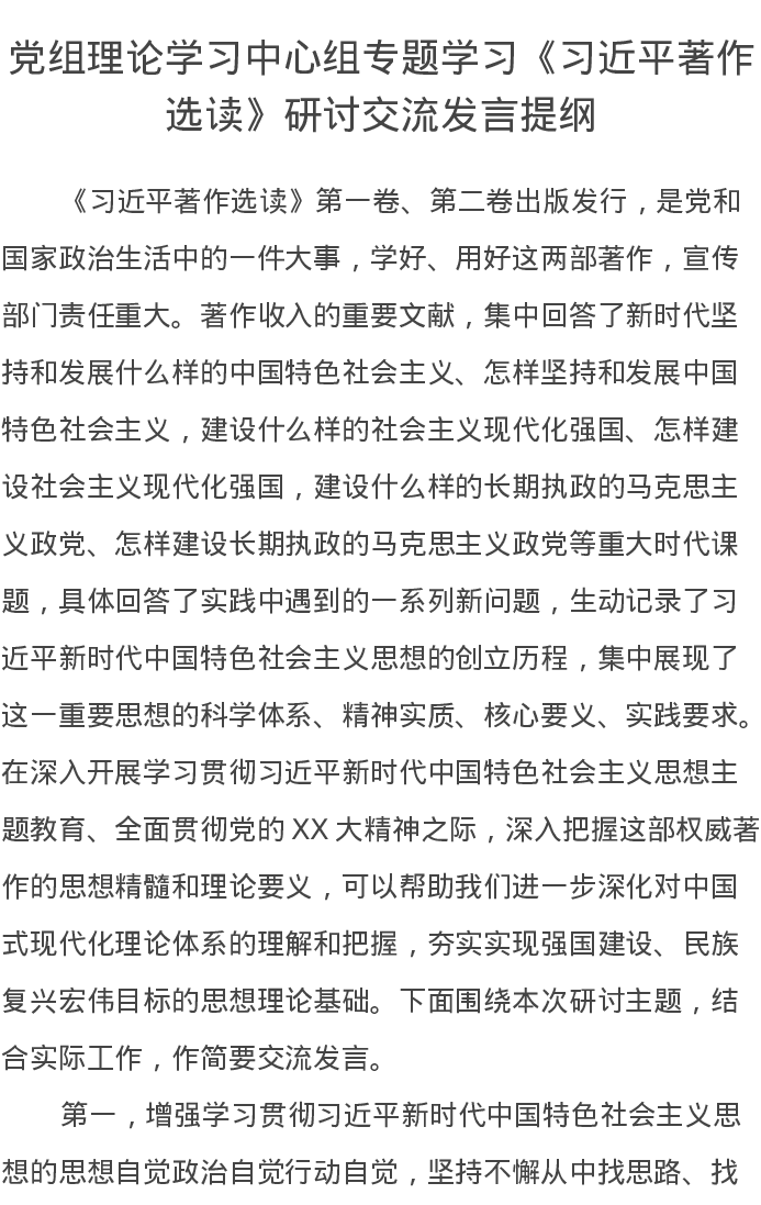 党组理论学习中心组专题学习《习近平著作选读》研讨交流发言提纲