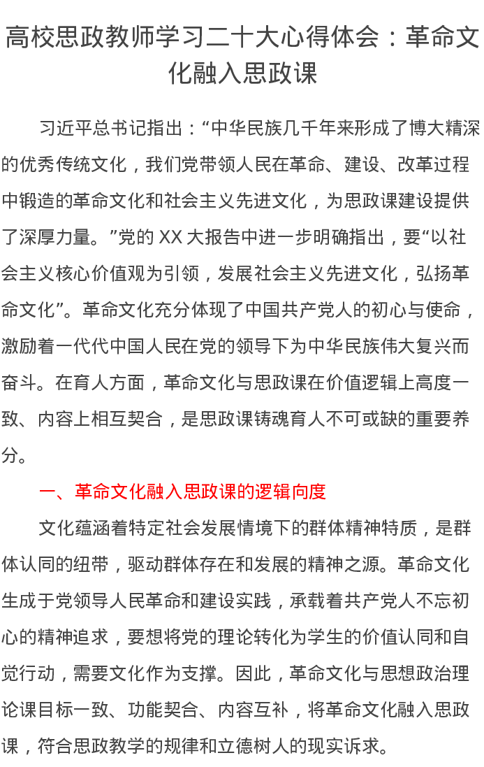 高校思政教师学习二十大心得体会:革命文化融入思政课