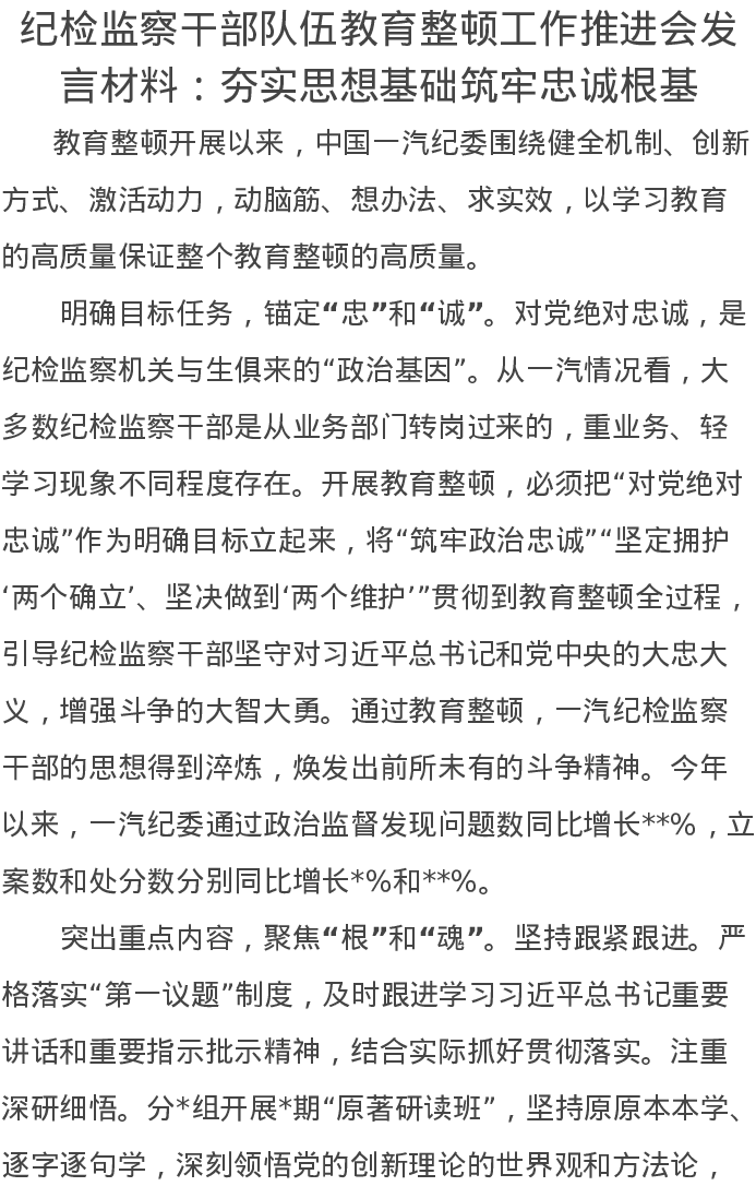 纪检监察干部队伍教育整顿工作推进会发言材料:夯实思想基础筑牢忠诚根基