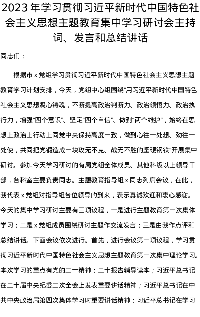 2023年学习贯彻习近平新时代中国特色社会主义思想主题教育集中学习研讨会主持词、发言和总结讲话