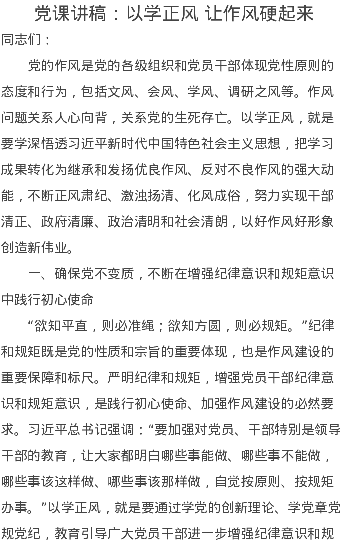 党课讲稿以学正风作风硬起来