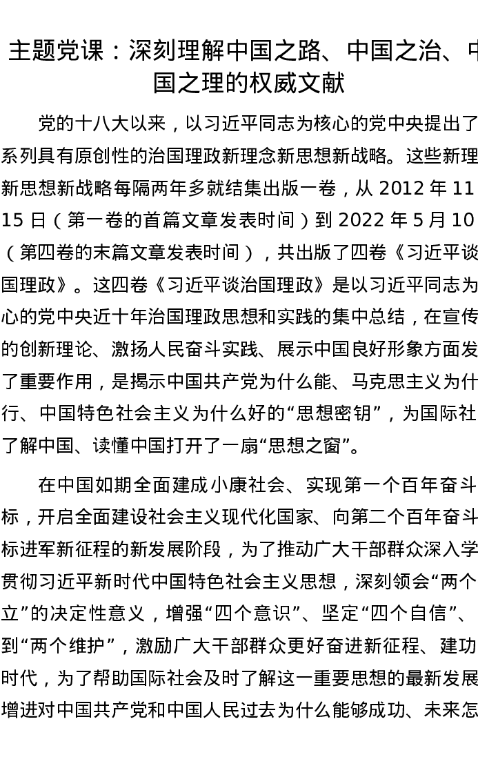 主题党课:深刻理解中国之路、中国之治、中国之理的权威文献