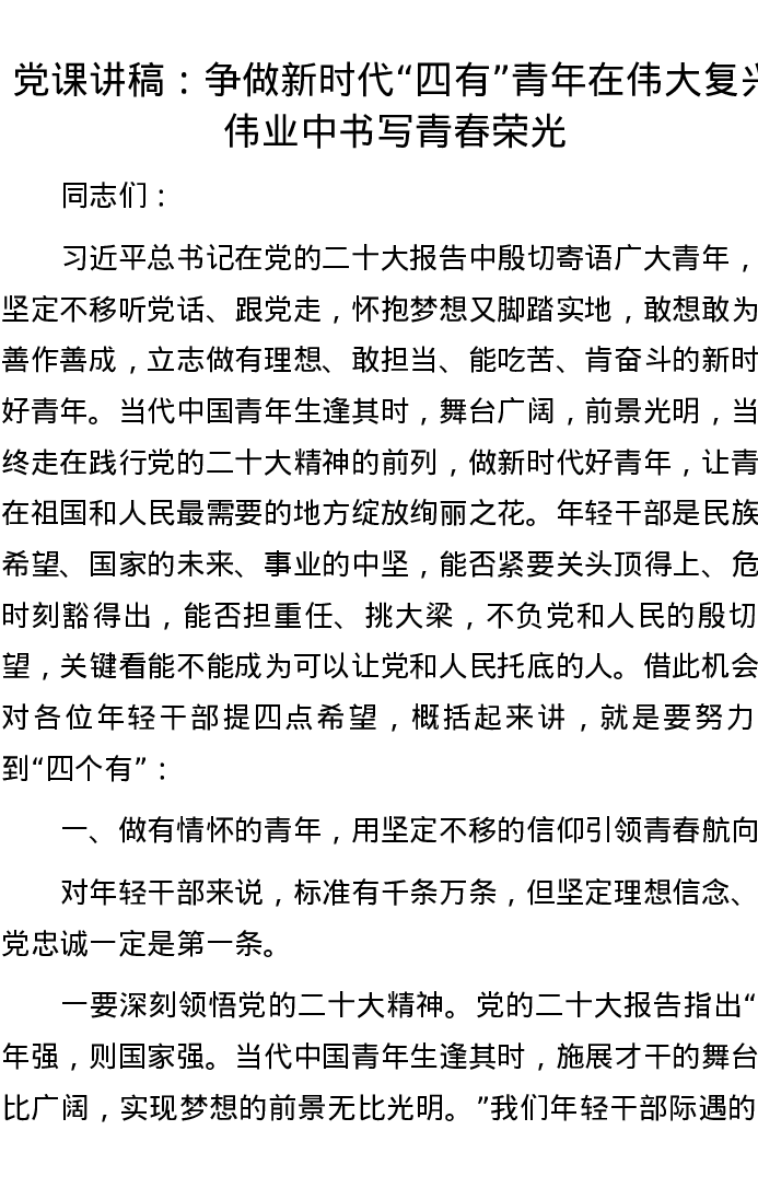 党课讲稿:争做新时代“四有”青年 在伟大复兴伟业中书写青春荣光