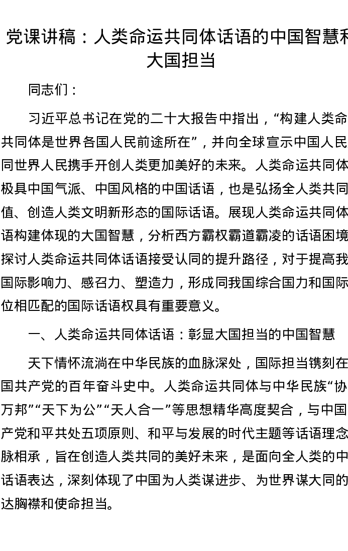 党课讲稿:人类命运共同体话语的中国智慧和大国担当