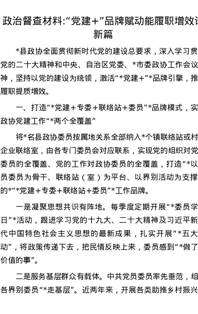 政治督查材料:“党建+”品牌赋动能履职增效谱新篇