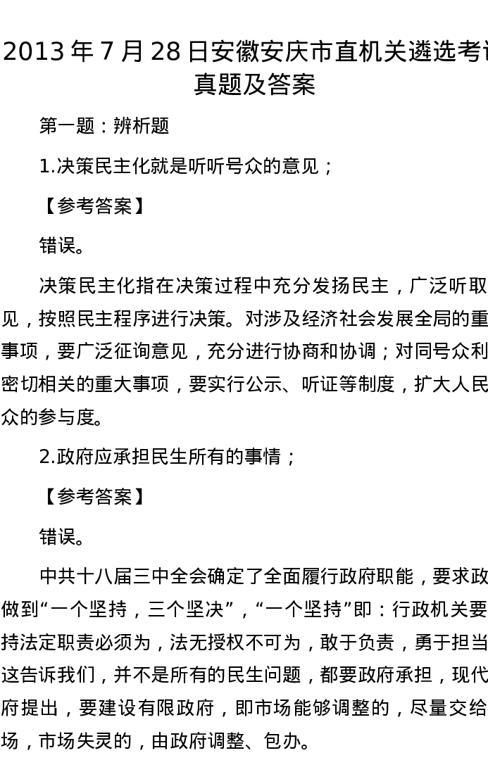 2013年7月28日安徽安庆市直机关遴选考试真题及答案