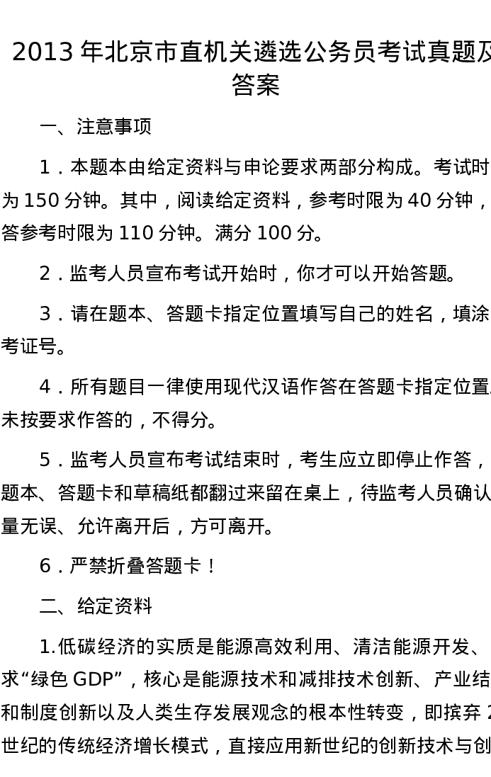 2013年北京市直机关遴选公务员考试真题及答案