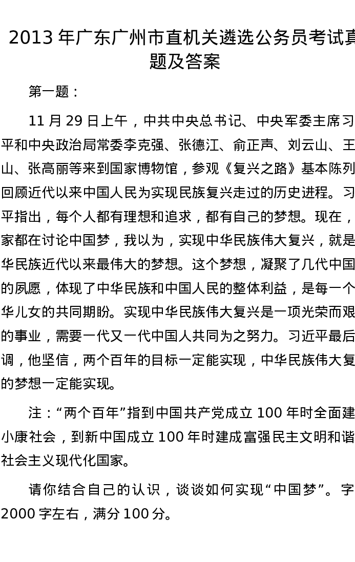 2013年广东广州市直机关遴选公务员考试真题及答案