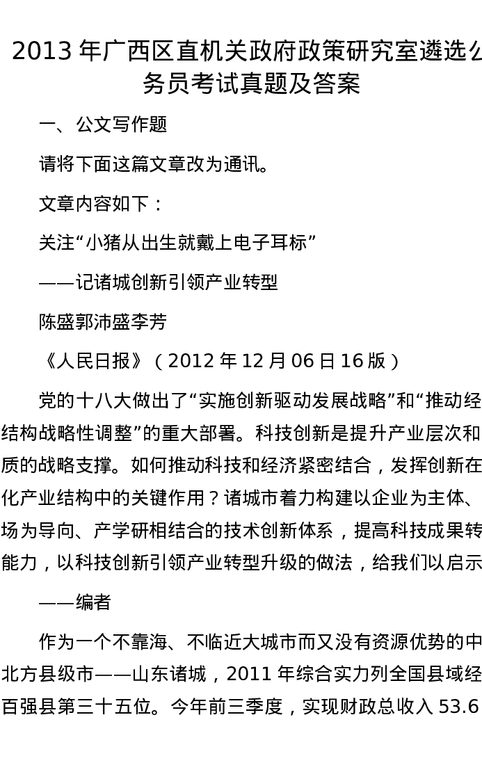 2013年广西区直机关政府政策研究室遴选公务员考试真题及答案