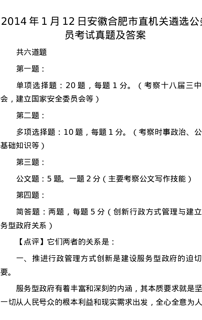 2014年1月12日安徽合肥市直机关遴选公务员考试真题及答案