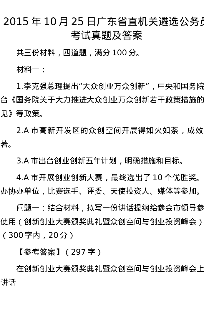 2015年10月25日广东省直机关遴选公务员考试真题及答案