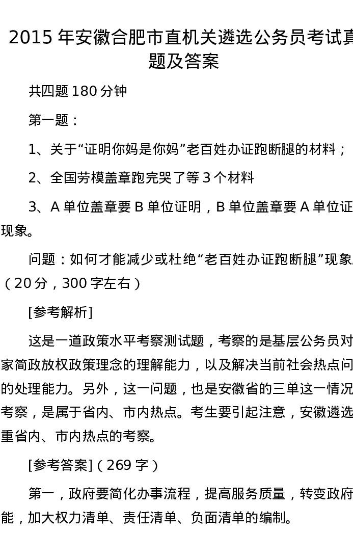 2015年安徽合肥市直机关遴选公务员考试真题及答案